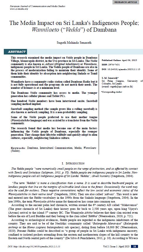 The Media Impact on Sri Lanka's Indigenous People; Wannilaeto (“Vedda”) of Dambana