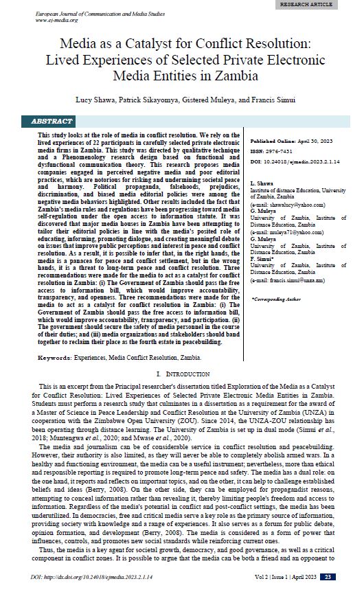 Media as a Catalyst for Conflict Resolution: Lived Experiences of Selected Private Electronic Media Entities in Zambia
