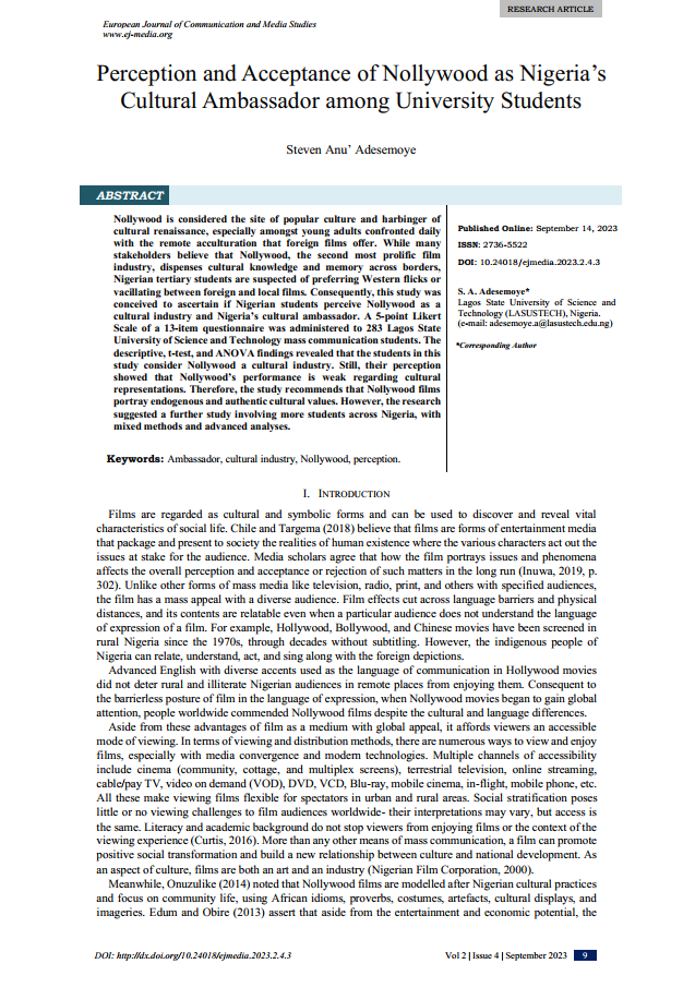 Perception and Acceptance of Nollywood as Nigeria’s Cultural Ambassador among University Students